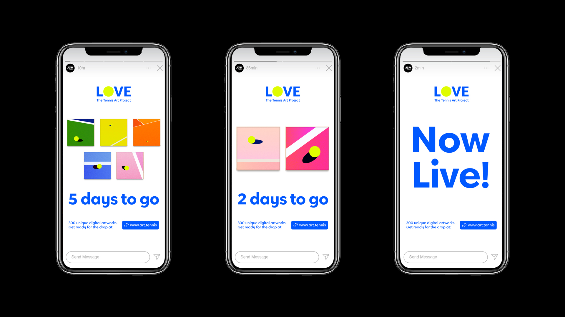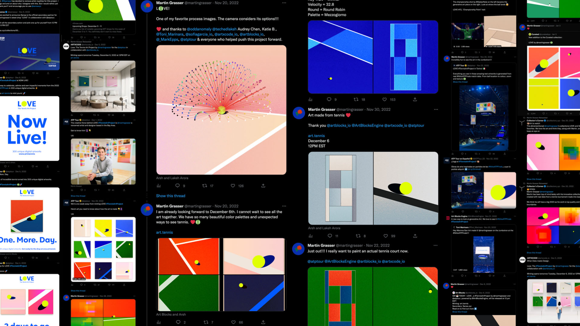 LOVE is a collection of 300 generative digital artworks that uses in-match sports data to celebrate impactful moments from the 2022 Nitto ATP Finals in Turing, Italy. Released with the ATP Tour and Art Blocks Engine.