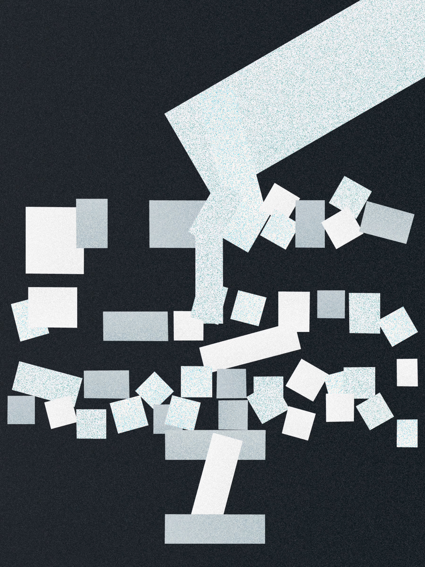 create digital texture-noise density, direction, fineness; # of shapes, scale, rotation placement, alignments, imperfections/irregularities - wonkiness of shapes, cutout shapes; limit colors, create palettes,