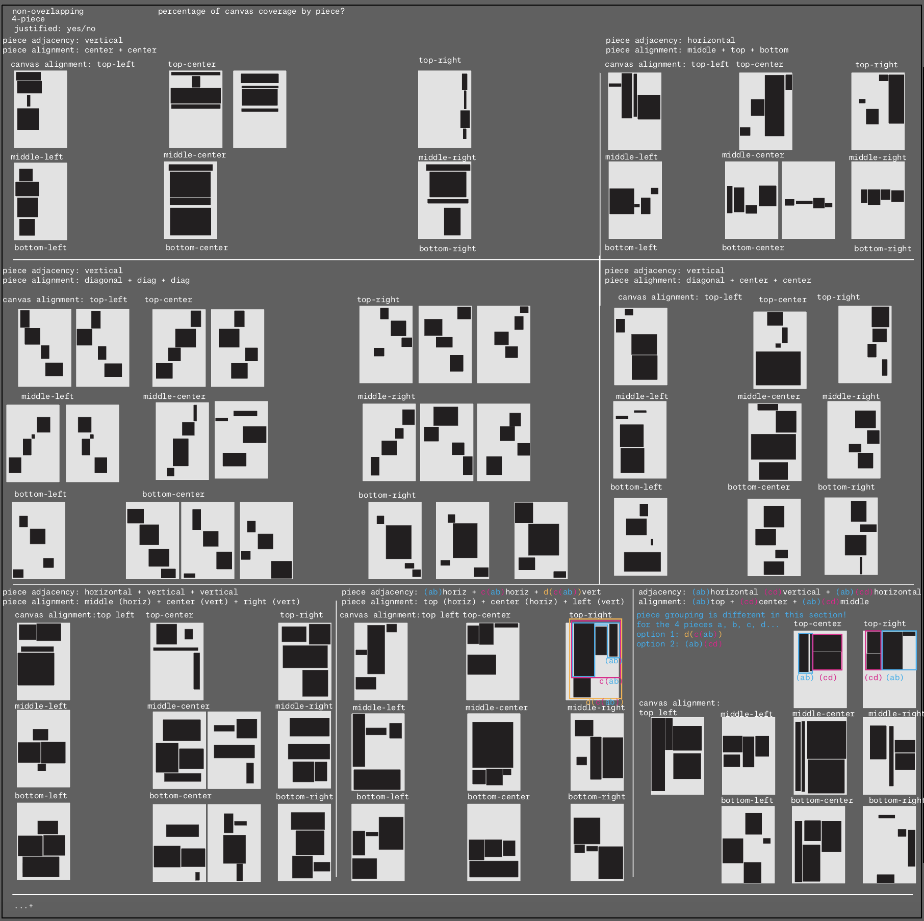 the result: 100 little algos. creating a range of pleasing arrangements important that this is about making, the continuous nature of a creative practice/process. and that we have tools at our disposal that allow us to explore be it analogue or digital. algo born from intuition. given the same shapes and colors, human and computer to play with, curious what different outcomes will be created, and what other -yet- unmade ones are possible. snapshots of a process. that can and will contiue