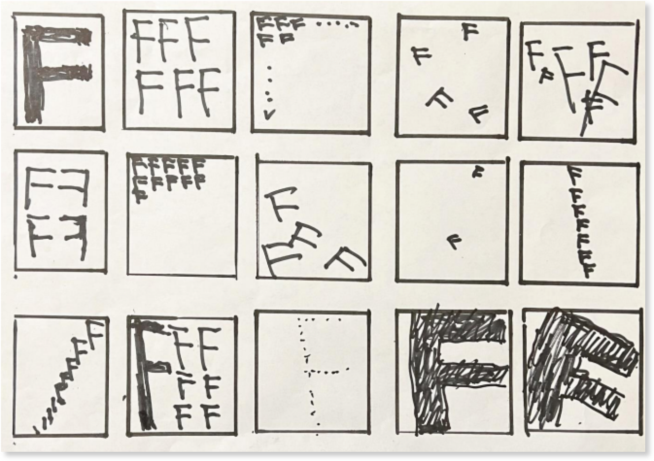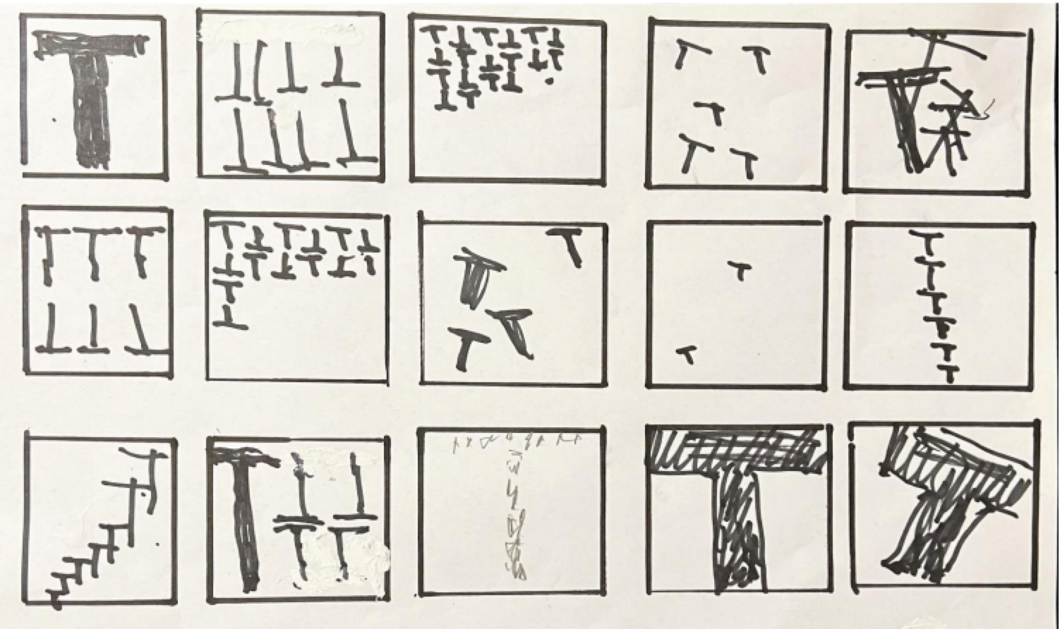 The project began with 45 pencil sketches by Vera, 15 for each letter N, F, and T.